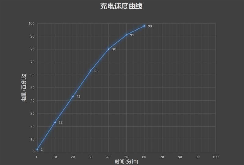 接下来我们从2%开始充电,总计耗时60分钟充到98%,相比较此前18W时代当中动辄100分钟+的充电体验可以说有了跨越式的进步提升。