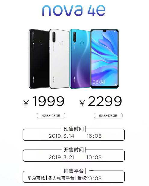 华为nova 4e是华为首款前置3200万像素的手机f/2.0光圈、四合一等效像素1.6μm,支持模拟3D算法等。配备了麒麟710处理器,最高6GB的存储和128GB ROM。后置相机方面,nova 4e采用了三摄,三颗相机分别为2400万像素主摄、800万像素和200万像素。配色方面,nova 4e拥有雀翎蓝、珍珠白、幻夜黑三款潮流配色。
