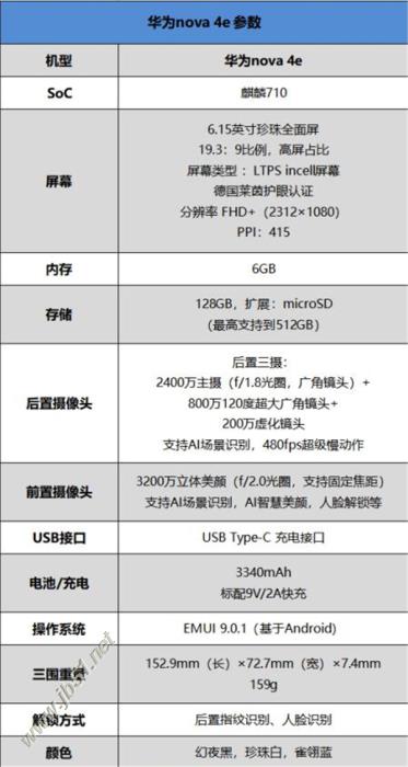 华为nova4e搭载麒麟710处理器,配备6GB及128GB的内存组合,再加上GPU Turbo技术的加持,手机GPU性能得到有效提升。该机配备3340mAH大电池,且支持9V2A Type-C、最高18W快充,可满足重度使用近一天。