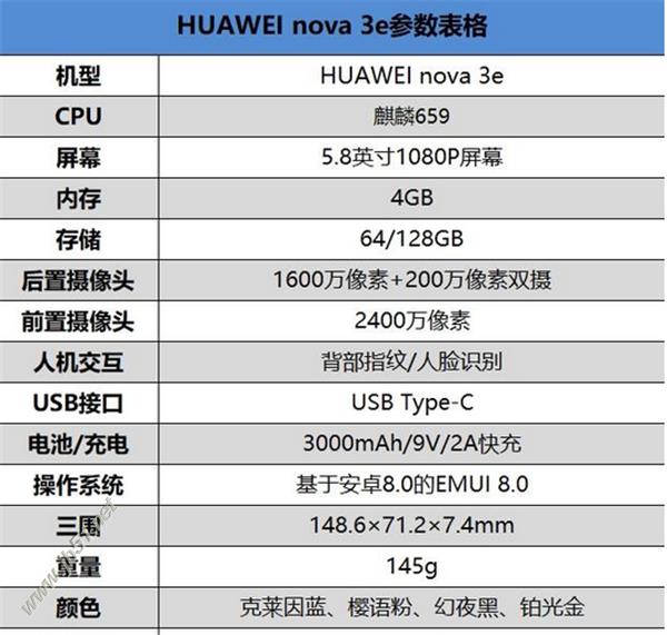 处理器方面,HUAWEI nova 3e搭载16nm工艺的麒麟659处理器,设计为2.36GHz的4个A53+1.7GHz的4个A53,GPU为Mali T830 MP2,16nm工艺制程让处理器的功耗更低。电池容量方面,华为Nova3e的电池容量为3000mAh,并支持9V/2A快充。