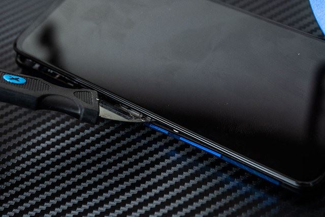 3、接下来需要拆卸后盖,iQOO后盖采用卡扣固定结构,由于贴合度非常高,很难找到缝隙把工具插入,因此分离后盖难度是很高的,建议从侧面或底部USB接口缝隙处找突破口。