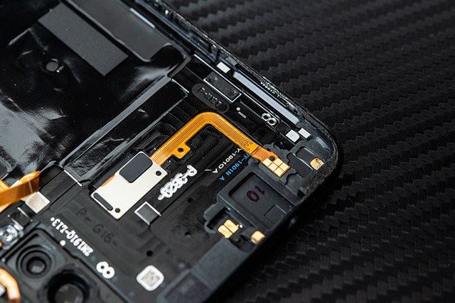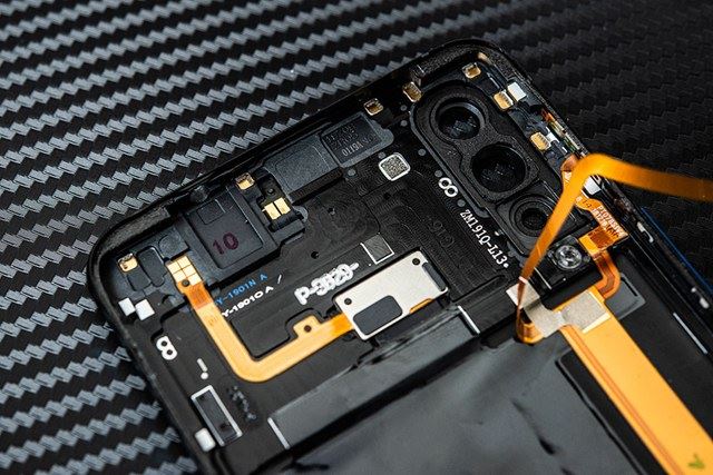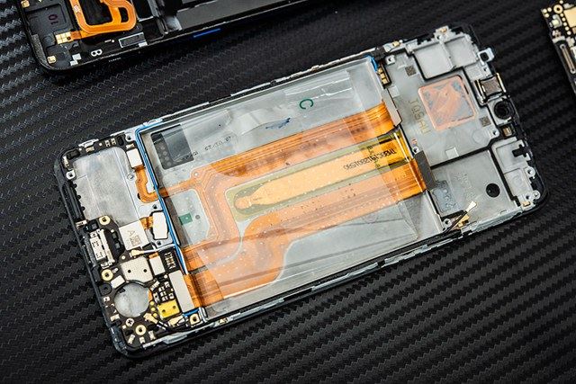 4、经过一番努力之后,我们终于将iQOO的后盖和机身分离,该机虽然配备屏幕指纹,不过机身和后盖之间依然有一条排线连接,这条排线小编的第一感觉应该是控制背面灯条的。