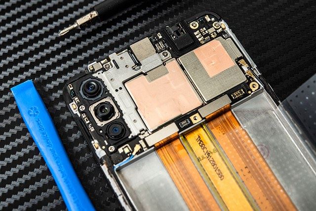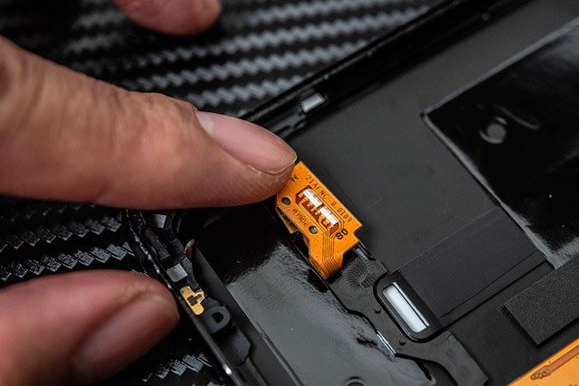 7、拆除排线的金属保护条后就可以起送分离排线了,这里的排线主要是电池、连接下方小版的数据线、后盖触摸按键排线和屏下指纹识别的数据线。