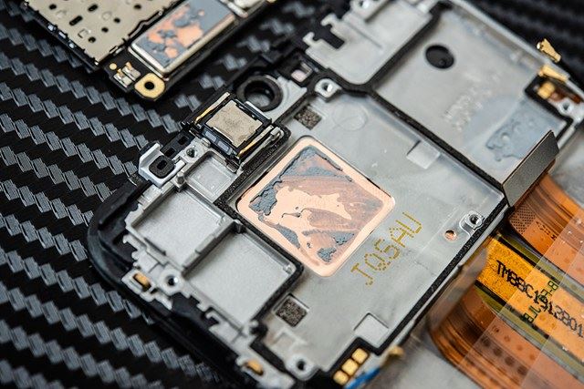 28、可以看到手机中框上对应手机CPU位置有一块铜片,这个铜片和手机的热管相连,起到散热的作用。