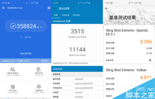 骁龙855的强劲实力不必多说,安兔兔358824分,Geekbench单核3515分多核11144分,3DMark Sling Shot测试5596分。