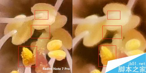 放大到400%对比可以看到基本与室内样张相符,Redmi Note 7 Pro有一定锐化痕迹,花蕊细节和边缘更清晰,但是颗粒锐化后显得画面有点脏,荣耀V20优势则在于色彩过渡更自然。