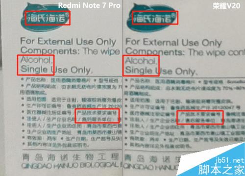 大图浏览模式下,因为咱们的拍摄主体酒精棉包装非常小,所以除了简单的发色倾向以外,咱们并没有太多可以评判的,咱们还是放大了看(原图尺寸太大,红米约15MB,荣耀10MB左右,压缩上传造成较大画质损失)。