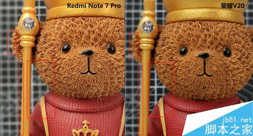 放大之后能比较明显看到V20确实有扣图遗漏区域,且权杖边缘也被虚化了,此处Note 7 Pro表现要好很多。耳朵部分二者都有一点翻车,Note 7 Pro边缘有点没处理干净,V20则是耳朵边缘也被虚化了,相较而言,Redmi Note 7 Pro整体表现要更好一些,看来在模拟大光圈虚化这样的场景,我们报以厚望的ToF摄像头并没有参与其中,不知道V20后期优化会不会考虑这方面的需求呢?
