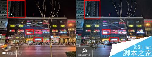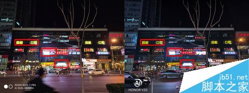 开启超级夜景模式之后,情况就有所不同了,荣耀V20的画面亮度大幅度提升,如楼栋侧面暗部,细节要明显多过Redmi Note 7 Pro,但是本来强项的高光抑制则被红米反杀,对比可以看到,Redmi Note 7 Pro将普通夜景样张中两个过曝的招牌都给救了回来。