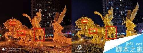 另一个情况和第一组样张基本一致,荣耀V20样张整体亮度更高,但是高光控制不如Redmi Note 7 Pro,雕塑的反光部位及灯光都出现了不同程度的过曝和高光溢出,相应部位的细节丢失,这么看来红米发布会上说自己高光抑制表现更好确实是真的,但是整体画面用户更喜欢哪款手机拍的,还是各花入各眼吧。
