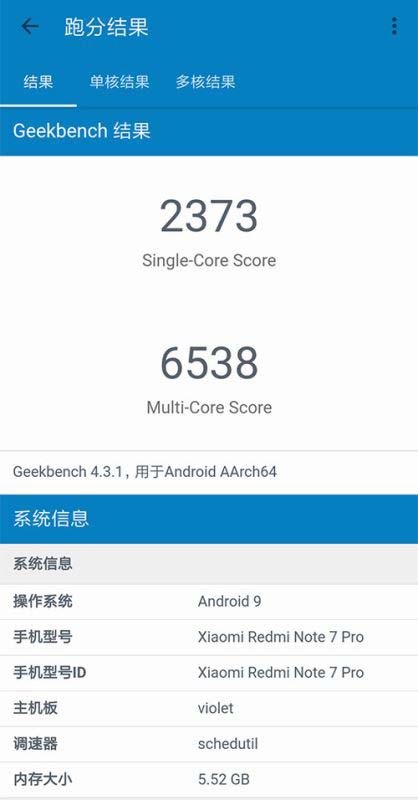 内在的提升是这次真正的Pro所在,首先是性能核心,从Redmi Note 7的骁龙660升级到了骁龙675,CPU提升很大,11nm制程工艺,2大+6小设计中的2颗大核心Kryo 460基于A76半定制,这也导致Geekbench单核跑分近2400,多核跑分6500+,甚至有点小超亲哥骁龙710。