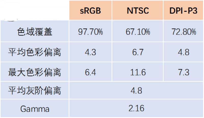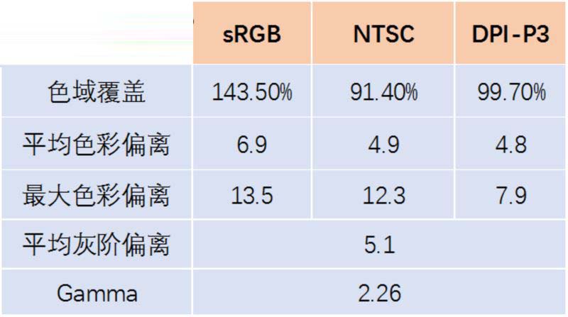 色温 7001K,色彩的覆盖比较优秀,覆盖整个 P3 色域,色准和灰阶表现比较一般。
