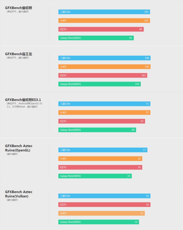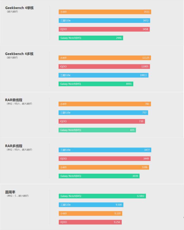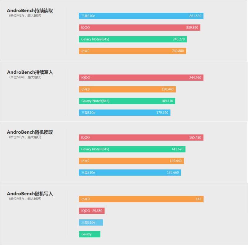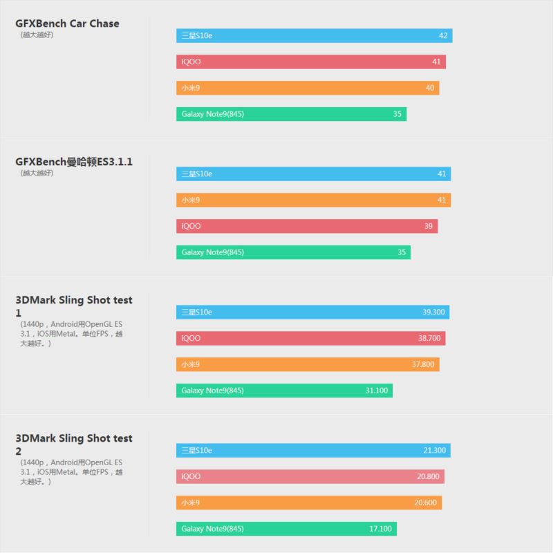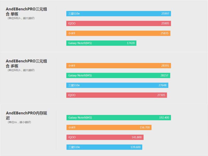 三星 S10e 国行版本采用骁龙 855 SoC,这颗芯片的具体表现我们已经在以往的文章分析过了。6GB LPRRD4x 2133MHz 内存,128GB UFS2.1 闪存,下面通过跑分对比一下同为骁龙 855 的小米 9 和 iQOO。