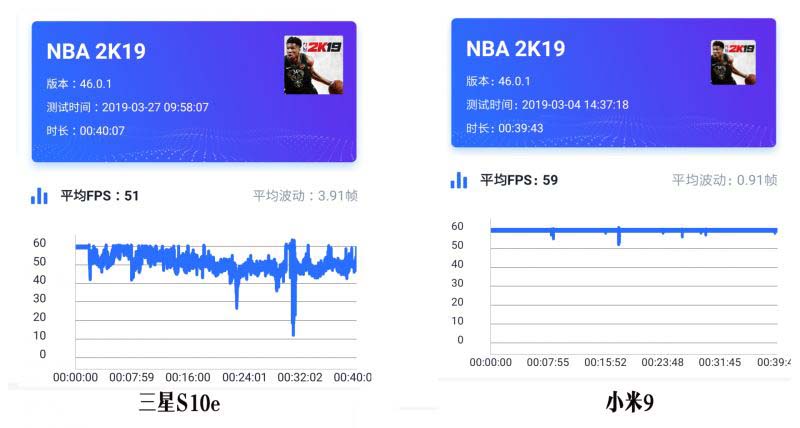 首先看 NBA 的游戏表现,平均 51FPS,平均波动 3.91FPS,而小米 9 这边全程满帧。