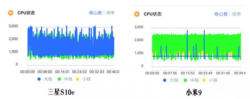 查看 SoC 调度情况,可以看出三星和小米是两种完全不同的调度方式,三星优先负载大核,游戏中大核一直保持较高的运行频率,小米优先负载中核,大核基本在摸鱼。
