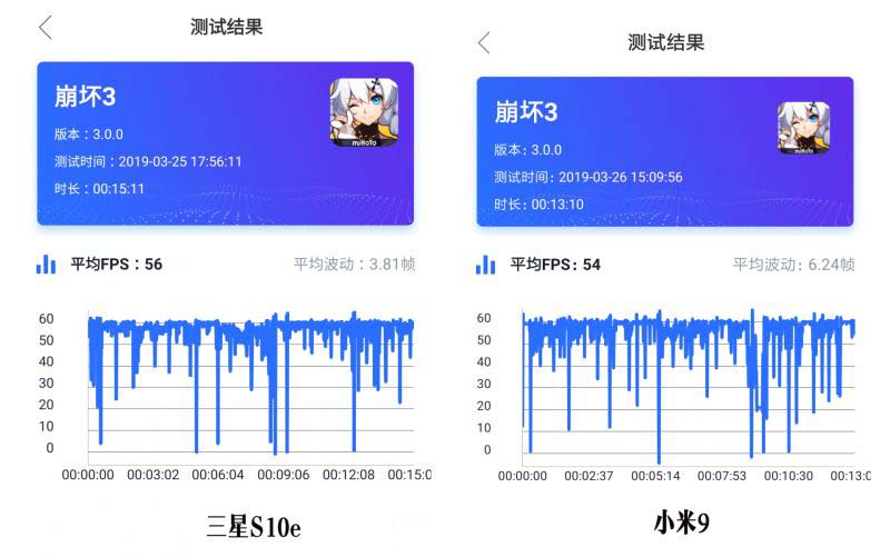 15 分钟开放世界,S10e 平均 56FPS,平均波动 3.81FPS,要比小米 9 平均 56FPS、波动 6.24FPS 略好。