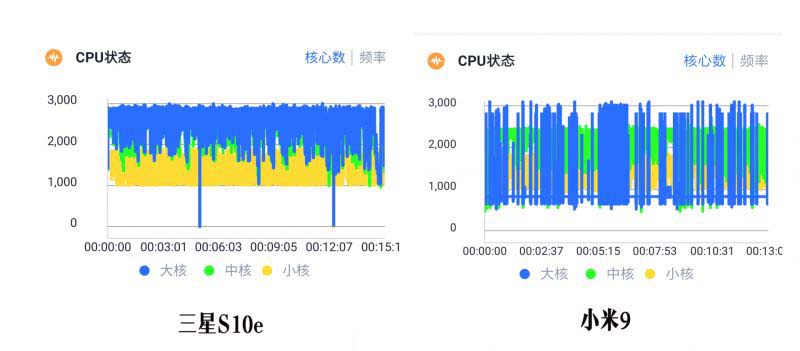 再来看一下两边的调度情况,和 NBA 类似,三星优先负载大核,而且所有核心频率都大于 1GHz,属于比较激进的类型,小米这边比较怂,大核心基本在低频的边缘疯狂试探。