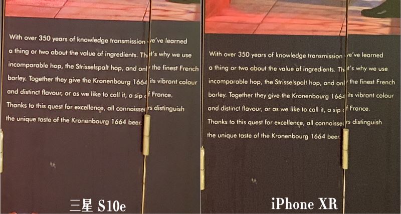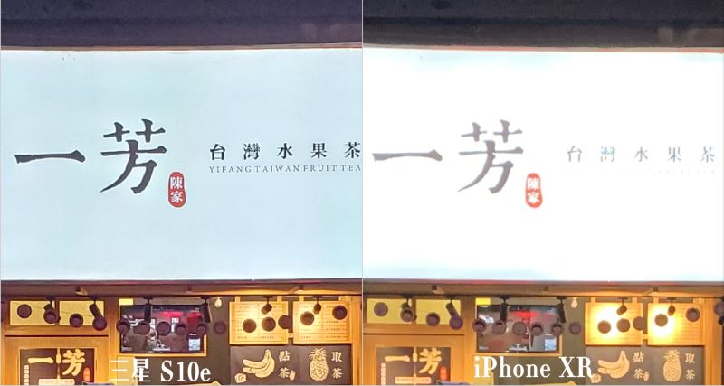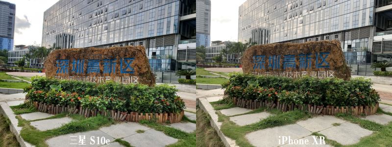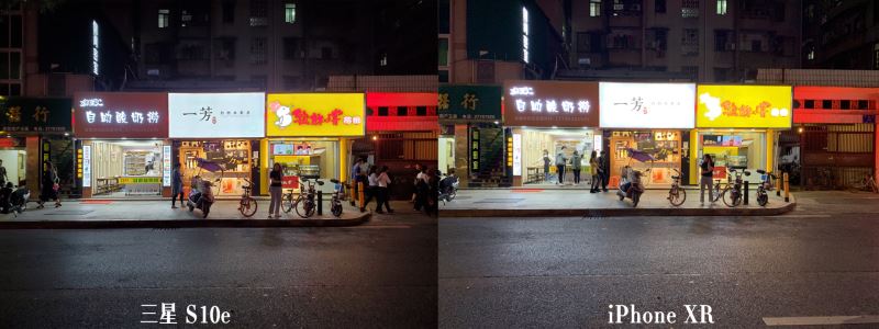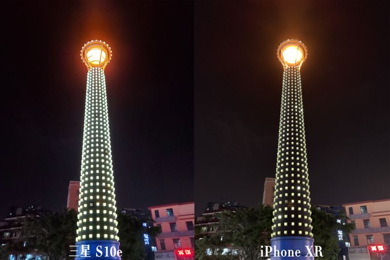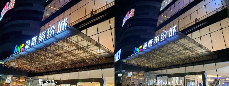 在夜间依旧维持了非常高的水平,拥有白天的特性,饱和度高,对高光的处理和降噪表现比较出色。S10e 综合拍照水平还是要比 XR 更胜一筹的,无论是成像质量还是玩法方面,毕竟 S10e 上还有一颗超广角副摄。