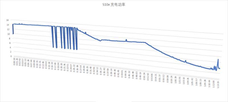 从 5% 开始使用联想口红 PD 快充套装进行充电,充满需要一小时十三分,最大功率仅有 14W 左右。S10e 快充水平继续原地踏步,就连万年环保快充的 iPhone 加钱上 PD 快充都能获得 20W 的峰值功率,可想而知当年 Note7 事件对三星影响有多大。
