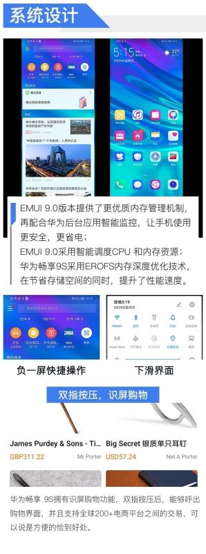 性能方面,华为畅享 9S搭载了12 nm工艺制程的麒麟710处理器,采用4个A73+4个A53大、小核CPU架构,相比上一代麒麟659系列,实现CPU性能提升75%,集成Mali G51-MP4 GPU,实现130%的性能提升。