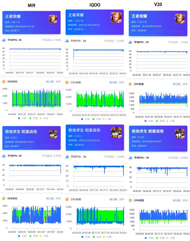 可以看到骁龙855或者麒麟980,帧率反应出游戏体验基本一致。三者中更推荐iQOO,侧边压感按键非常适合吃鸡游戏。