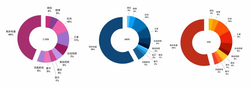 小米9不太建议重度用户选择,毕竟电池只有3300mAh,另外俩都是4000mAh大电池。续航测试每一项场景运行半小时,掉电百分比与剩余电量情况如下。
