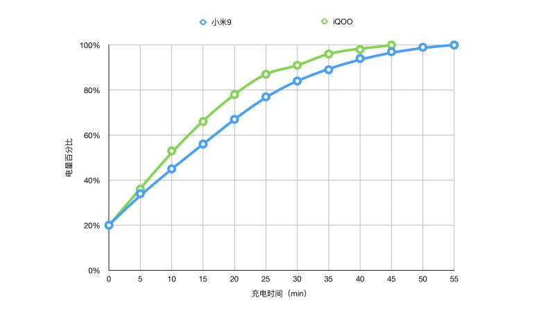 三者均支持快充,其中3298元版本iQOO标称功率高达44W,这里需要说声抱歉的是,荣耀V20原装充电头找不到的,所有只有两条充电曲线。