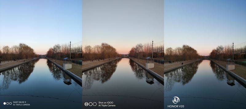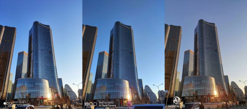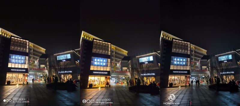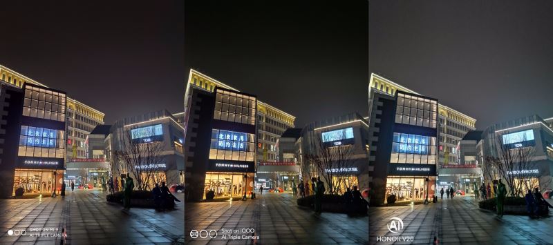 严格意义上来说,只有小米9是后置三摄,覆盖全焦段。iQOO也有超广角,但不具备长焦。荣耀V20则比较前卫玩起了TOF,但对拍照成像没啥用。