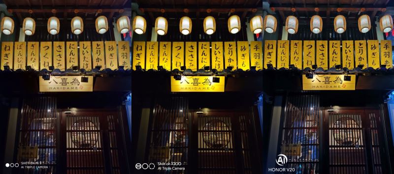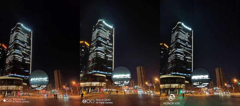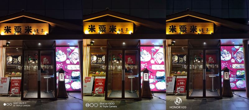 这组夜景模式对比,荣耀V20还没更新固件,高光压制甚至还不如iQOO,小米9表现最好。不过更新固件后,荣耀V20效果提升明显。