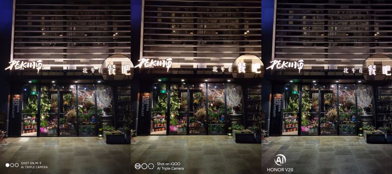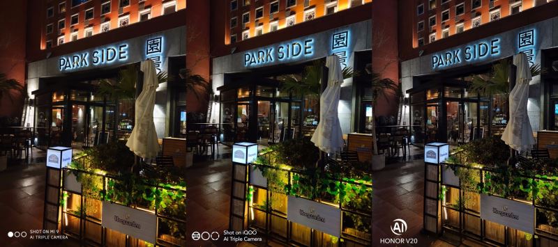 小米9和荣耀V20的动态范围明显比iQOO更好,高光处保留的细节更多。小米9色彩饱和度对比看偏低,整体看下来荣耀V20表现最好。
