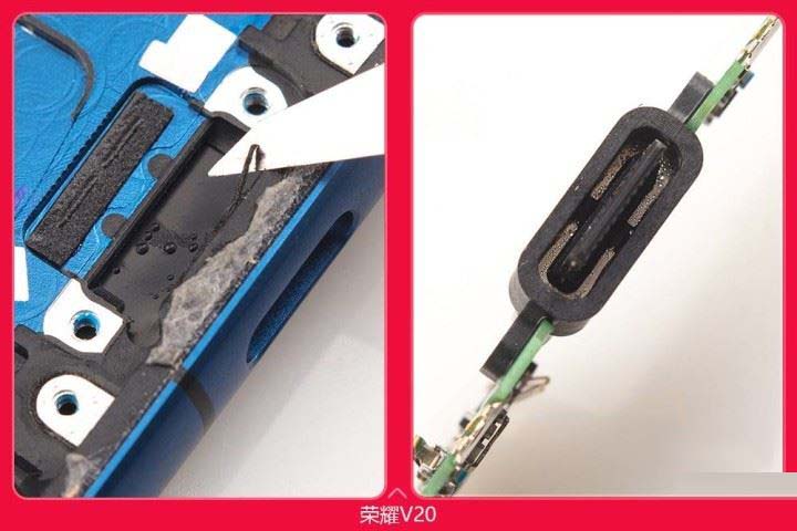 可以看到不管怎么吹气子电路板上没有任何水珠凝结,说明灰尘并不能从接口进入手机内部。荣耀V20的数据接口采用了半包设计,数据接口外突只包了原来的一半,另外一半由手机金属外壳保护,防止反复插拔的变形松动。此外数据接口后面采用了滴硅全封闭防尘。