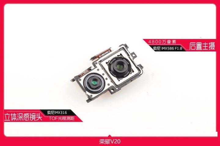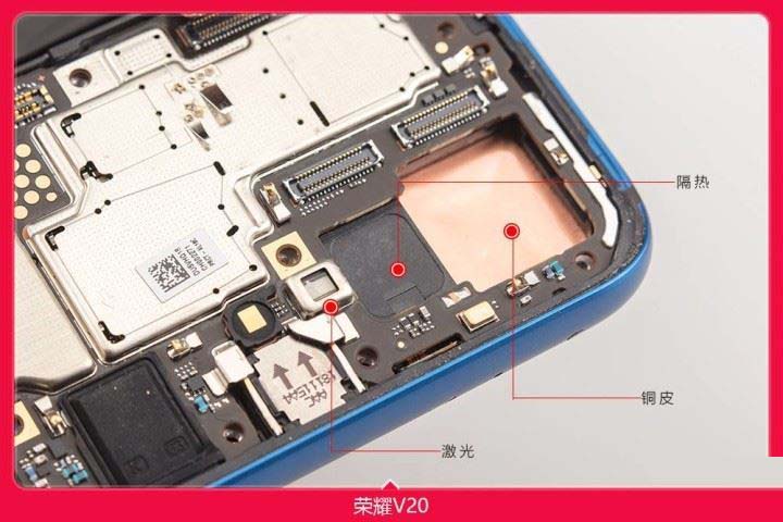 荣耀V20配备和激光发射器来配合TOF,防止外部光线的干扰确保更加精确的数据。而摄像头散热上4800万像素的摄像头COMS更大了分辨率更高了,相应的工作时采生的热量相对也多一些,因此采用将金属中框打通直接在屏幕上加贴铜皮进行散热,因此主摄像头的很大一部分热量都是通过屏幕带出。而TOF摄像头发热相对较低因此采用了纳米材料隔热量来防止主摄像头和热管附近的热量回流影响TOF摄像头,从而精保测量数据的精准。