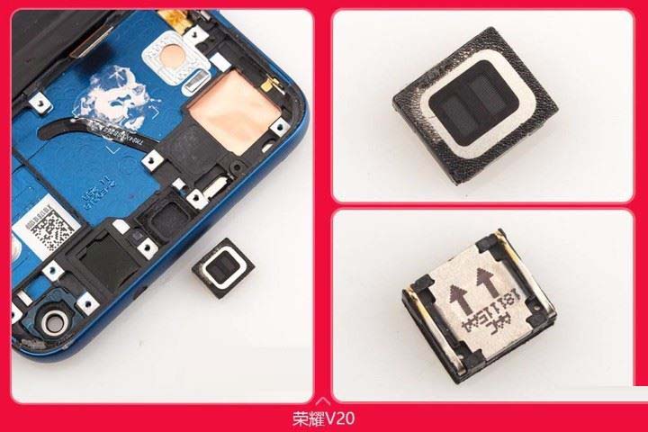 荣耀V20将光线距离感应器移支了顶部,给屏幕留出了更多的空间,同时听筒充分利用顶部屏幕和金属框之间的狭小空间实现同时加盖了金属防尘网。