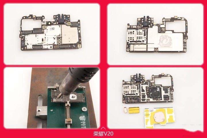 荣耀V20对主板进行了全金属罩封闭来确保运行时信号的干扰,不得不上热风枪拆除。(此步骤风险高不建议大家尝试)