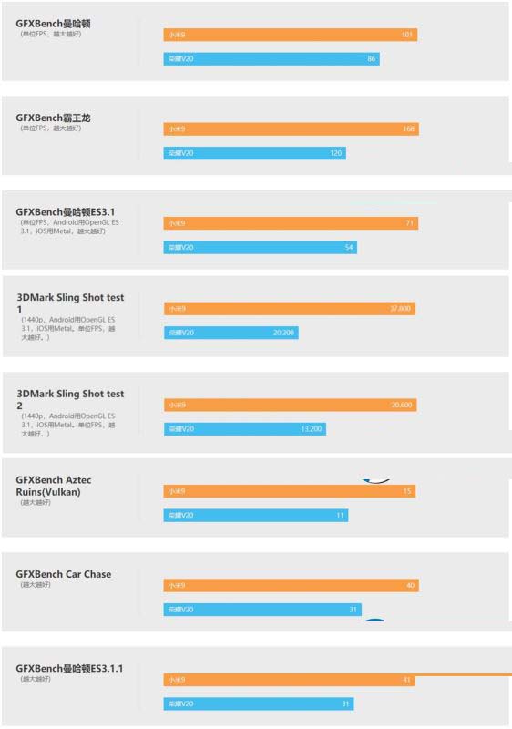 小米 9 搭载了高通骁龙 855 SoC,而荣耀 V20 则是麒麟 980,两者都是安卓阵营中的顶尖存在(国行没有 Exynos~),在 CPU 方面,它们的表现都十分出色,日常使用没有毛病,而在 GPU 方面,由于 Mali-G76 天生较弱,所以即便有着 GPU Turbo 2.0,但绝对性能面对起 Adreno 640 来说,还是... ...