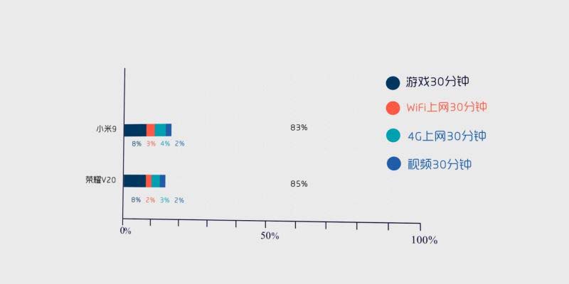 小米 9 配备了 3,300 毫安时容量的电池,V20 则是 4,000 毫安时,在经过两小时的续航测试后,前者剩余电量为 83%,后者则是 85%。可能 2% 的差距看似不大,但随着一天高强度的使用下来,这个数字会越变越大。
