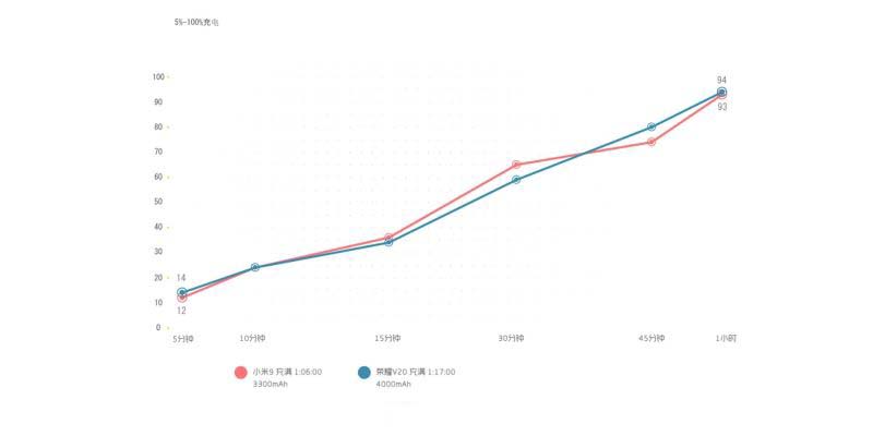 但是在充电方面,小米 9 就很厉害了,配备 27W 电荷泵快充,实测峰值功率超过了 24W。虽然荣耀 V20 并没有像 Magic2 那样配备 40W 超级快充,但好歹也有 22.5W。从 5% 充至 100%,小米 9 一共需要 66 分钟,而 V20 则需要 76 分钟。