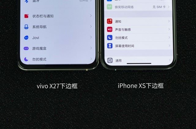 vivo X27相对完美的全面屏,也存在不足于iPhone XS的地方,为了追求手机四边框的等同,iPhone XS采用了专业定制的窄下边框屏幕,与vivo X27的下边框相比,要明显窄了不少。