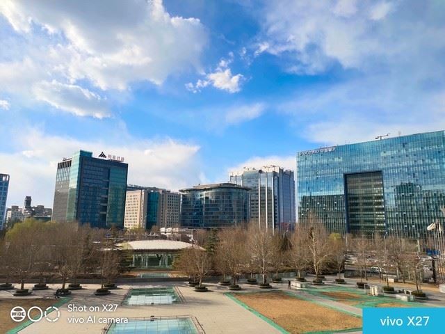 在室外的大场景上,vivo X27的场景识别可以更好的突显景物的颜色,让拍摄的天空蓝的更加艳丽,减少后期的修图工作;iPhone XS拍摄的景物则相对暗淡,但也更加的真实,符合自然的环境。