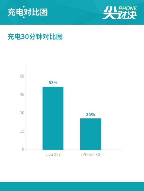 有着大电池加持的vivo X27,在续航上自然要比iPhone XS具有优势,经过5小时的重度测试,剩余电量还大于50%,不仅是续航上,在充电上X27也具有优势,22.5W的闪充30分钟即可恢复一半的电量,满足对手机充电的速度需求。