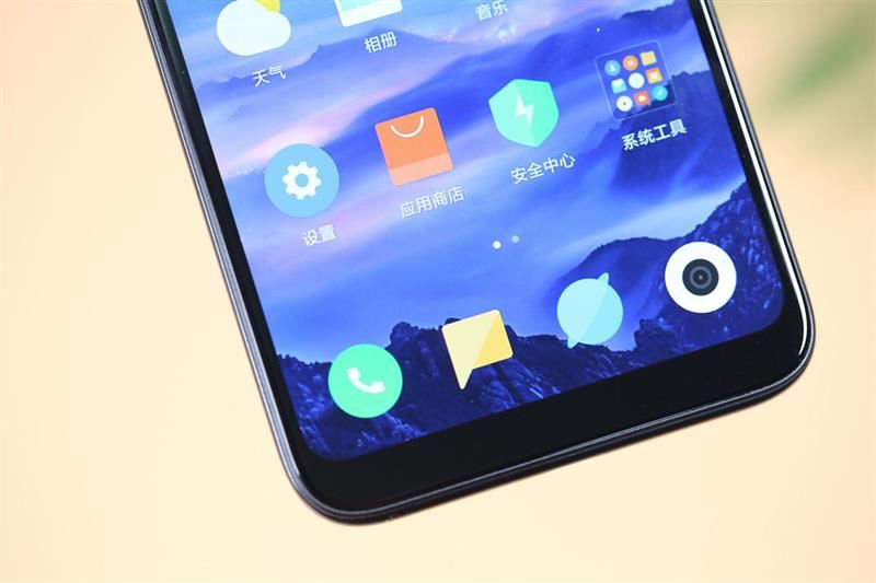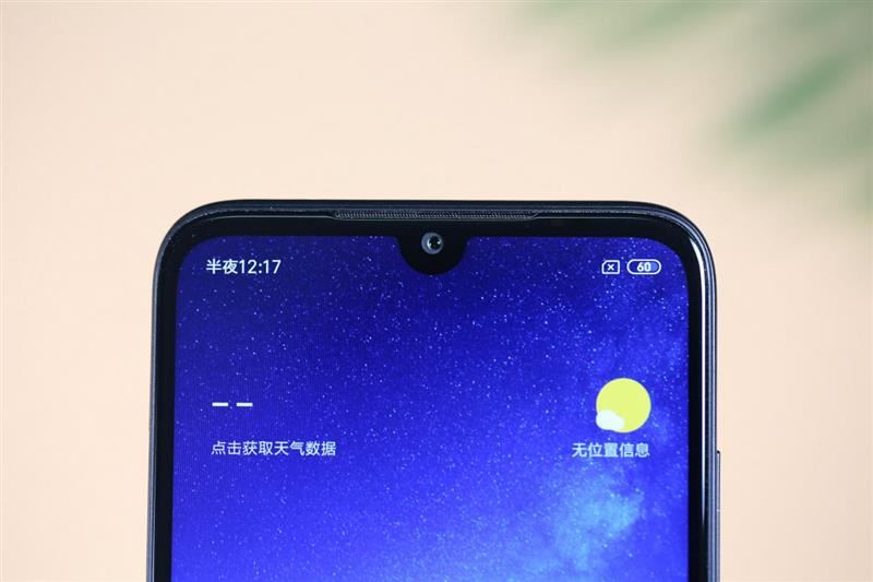 红米开始在百元机当中普及了水滴刘海屏设计,可以看到红米7的前置镜头以及部分传感器被集成在了顶部中央的水滴状非显示区域。关于状态呼吸灯被从此处拿掉,以隐藏式设计挪移到了下巴上。