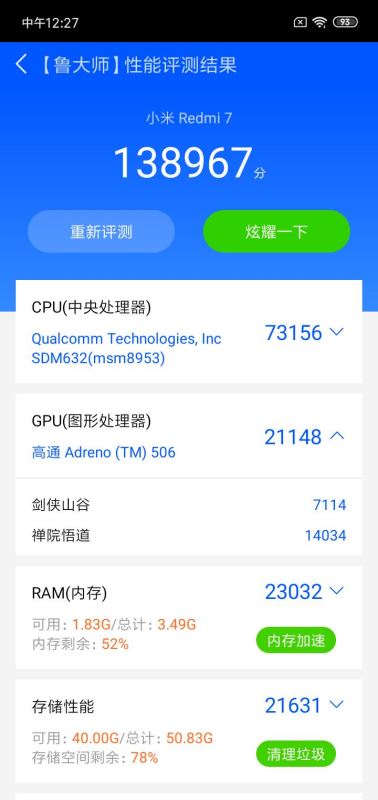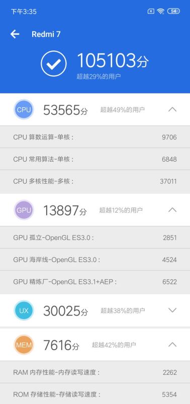 红米7的安兔兔跑分成绩,刚刚过10万分,典型的入门级水准,符合这个价位的机型的正常表现。