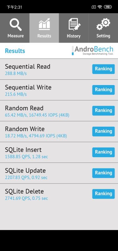 Androbench简介:AndroBench是一个基准测试应用,可以测量Android设备的4K随即存储·存储性能,包括内部或外部存储。