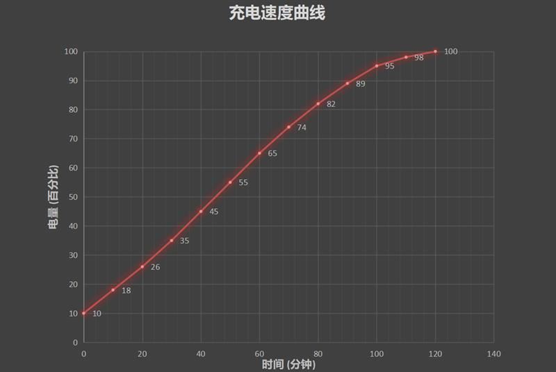 由充电速度曲线可见,使用10W充电器的情况下,从10%电量开始充电,连接Wi-Fi,不插卡,10分钟记录一次,共耗时120分钟充满。