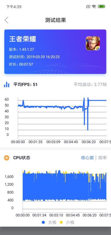目前《王者荣耀》的高帧率模式最高支持60FPS,可以看到, KFMark测得《王者荣耀》游戏平均FPS为51帧,帧数的平均波动在3.77帧,作为百元机,红米7的游戏帧数表现基本符合预期超过50帧的帧率表现足够保证正常的游戏体验。