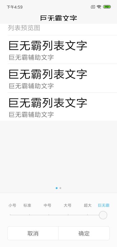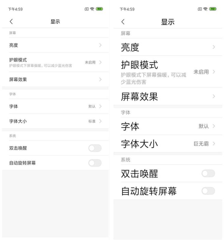 为了照顾到老年群体的需求,红米7相对于其它手机增加了两档更大的字体,一共六档字体可选。来感受一下标准字体与巨无霸字体的视觉悬殊: