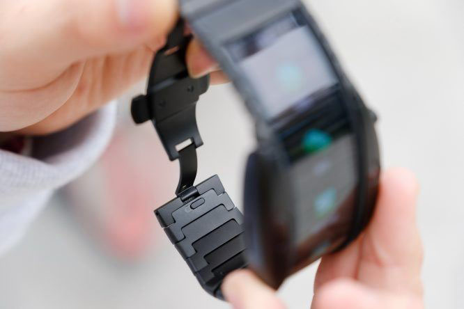 事实上,努比亚阿尔法采用了传统链式金属表带设计,环环相扣的金属表链采用机械卡扣相连,用户可以自行通过滑动的卡扣脱卸表链,来调整手表的松紧。努比亚阿尔法的表链采用了316L不锈钢材料,外表提供了黑色的PVD电镀喷涂,这种处理让手表的外观少了一些冰冷的触感,类肤质的观感显得更细腻。