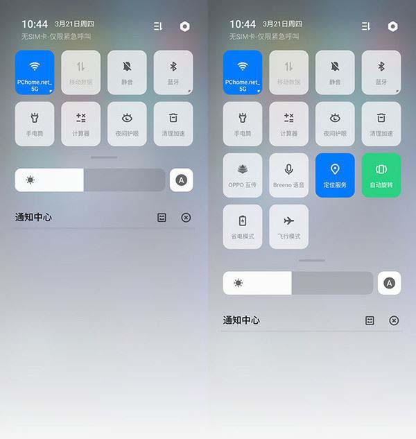 通知中心是ColorOS 6所有界面中变化最大的,所有开关变成了大图标,底层则是毛玻璃。画面亮度调节采用了滑条设计,通知中心则是流行的折叠卡片样式。