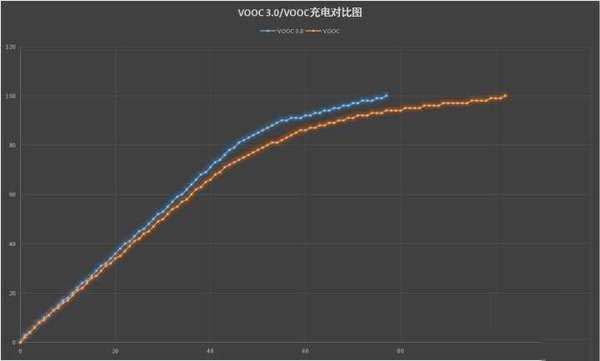从测试中的充电曲线我们能看出,这是一条相当平滑的曲线,即使在充电的最后阶段,也依旧保持了曲线的坡度,并没有特别明显的坡度变化。这也就表明,Reno手机在充电80%之后的充电阶段,并没有出现明显的充电速度降低,而正是最后恒压充电阶段的高速,才让VOOC 3.0有了更高的充电效率。