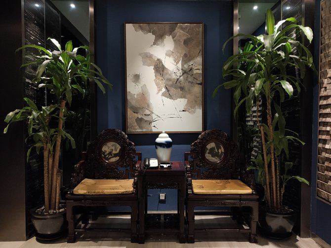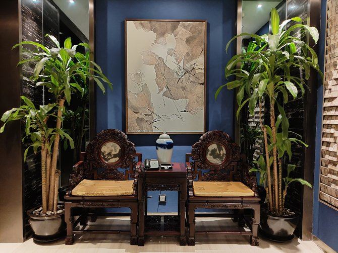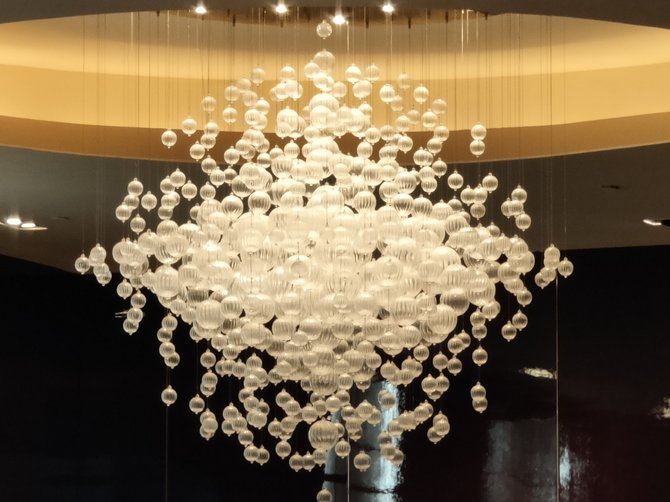 光线不是十分充足的室内,酒店大堂远处的吊灯工艺品,可以看到玻璃制品上的细节呈现。